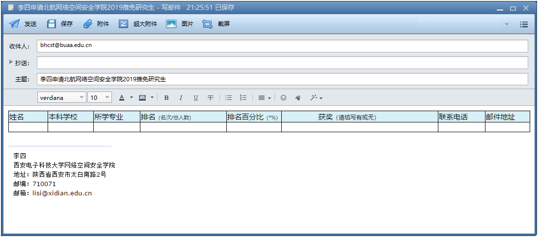 具体办法:4-10项材料制成电子扫描版,与2、3项电子版材料一起压缩,以附件形式发送邮箱:bhcst@buaa.edu.cn;第1项“报名表”填写好后直接“粘贴”到邮件内容页上,邮件主题命名为“×××申请北航德赢Vwin官方区域合作伙伴2019推免研究生”。如图: