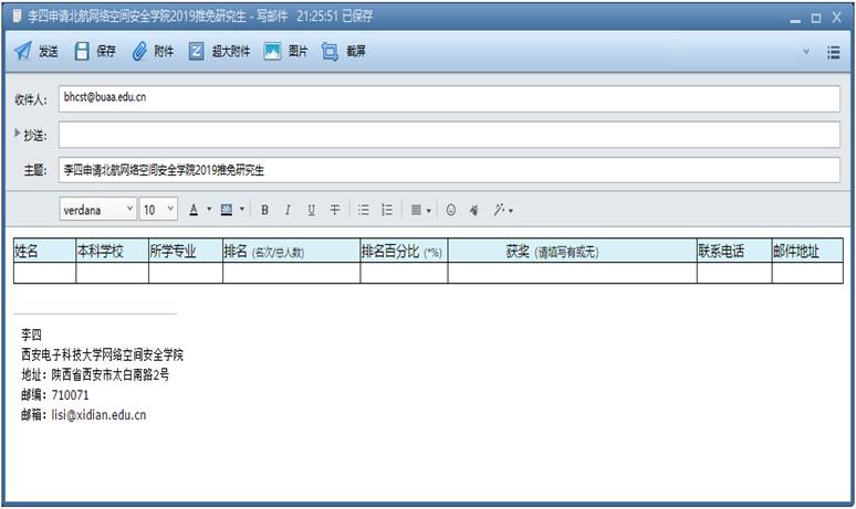 具体办法:4-10项材料制成电子扫描版,与2、3项电子版材料一起压缩,以附件形式发送邮箱:bhcst@buaa.edu.cn;第1项“报名表”填写好后直接“粘贴”到邮件内容页上,邮件主题命名为“×××申请北航德赢Vwin官方区域合作伙伴2019推免研究生”。如图:
