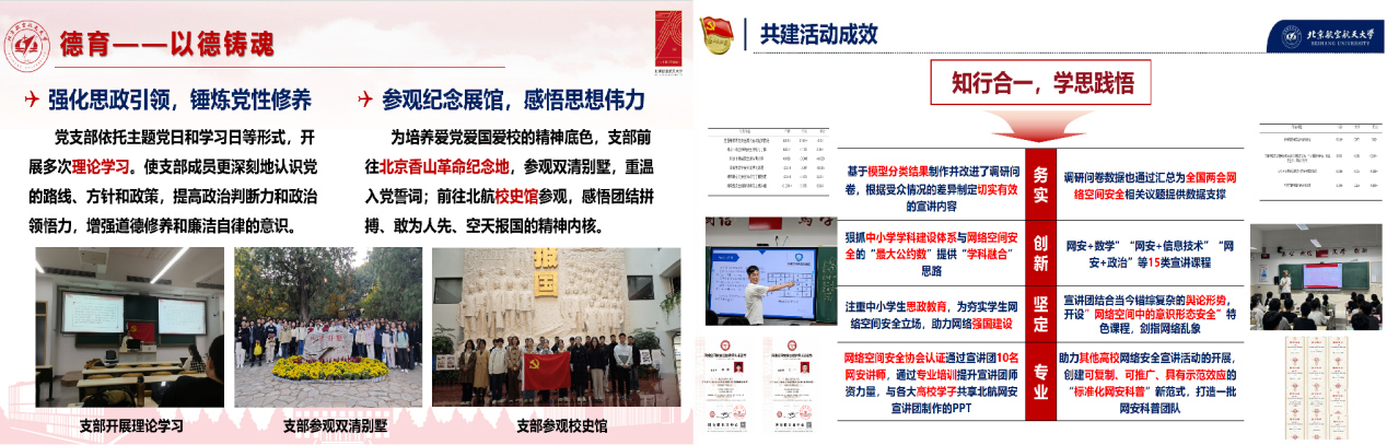 为推动各支部间经验交流与资源共享,硕士24级学生党支部书记颜家宁同志和本科生第二党支部书记李天宇同志分别围绕“五育并举”和“网络安全宣讲”分享了党创基金及红色“1+1”活动中的优秀项目经验。通过分享,其他支部借鉴先进做法,树立可参考的标杆,实现党建资源的合理配置,充分发挥集体智慧,推动学院整体党建水平的提升。