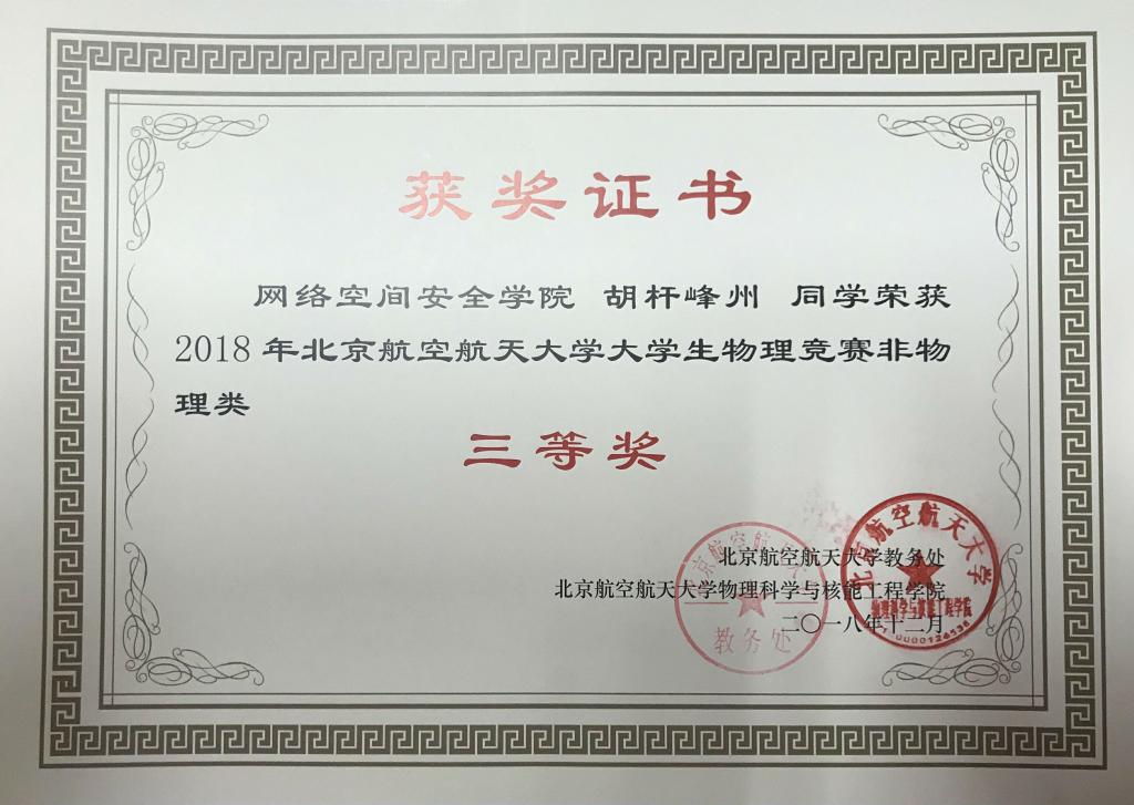 德赢官网优秀学生胡杆峰州获“2018年德赢Vwin官方区域合作伙伴大学生物理竞赛非物理类”三等奖,予以表彰。