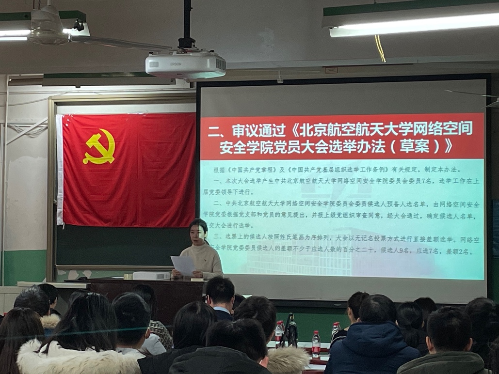 首轮选举结果中,有两位候选人票数相同且均未超过应到会党员的半数,故大会根据表决通过的选举章程再次进行了针对两位平票候选人的投票。第二轮投票结果中,两位候选人的得票数仍均未超过应到会党员的半数。经与会全体党员表决,多数人同意减少新一届党委委员数量至6人,其中81人赞同,2人反对,10人弃权。最终,在监票人监督下,经计票人计票,从9位候选人中差额选举产生了6位中共德赢Vwin官方区域合作伙伴网络空间安全学委员会委员,分别为:刘建伟、伍前红、李圆圆、尚涛、祝贺、蒋燕玲(按姓氏笔画排序)。大会在激昂的《国际歌》声中圆满结束。